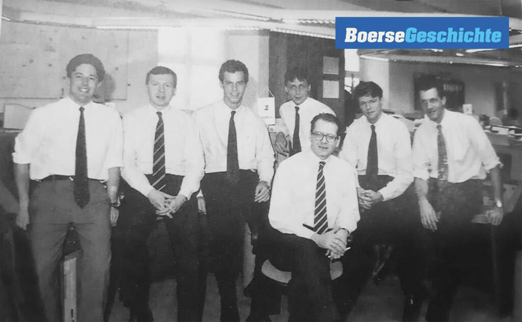 #boersegeschichte 1992: Im Erste-WP-Handelsraum Michael Richter, Christian Sehnal, Sascha Svoboda, Willi Celeda, Michael Spiss, Michael Neubauer, Ulrich Baumann