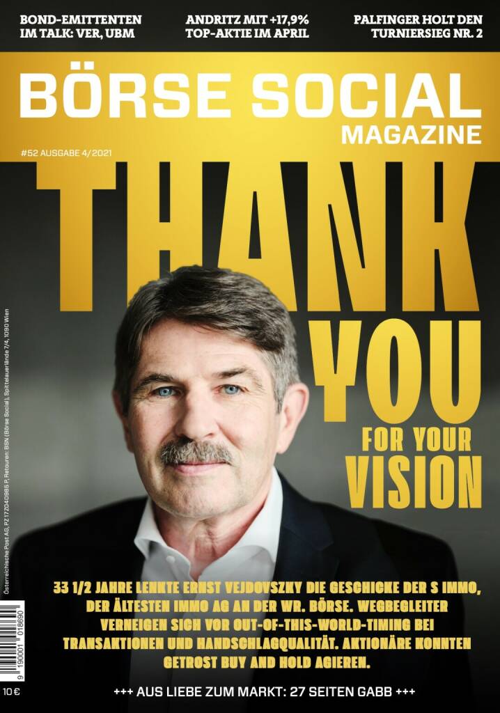 Magazine #52 - April 2021: Thank you for your vision - 33 1/2 Jahre lenkte Ernst Vejdovszky die Geschicke der S Immo, der ältesten Immo AG an der Wr. Börse. Wegbegleiter verneigen sich vor out-of-this-World-Timing bei Transaktionen und Handschlagqualität. Aktionäre konnten getrost buy and hold agieren.